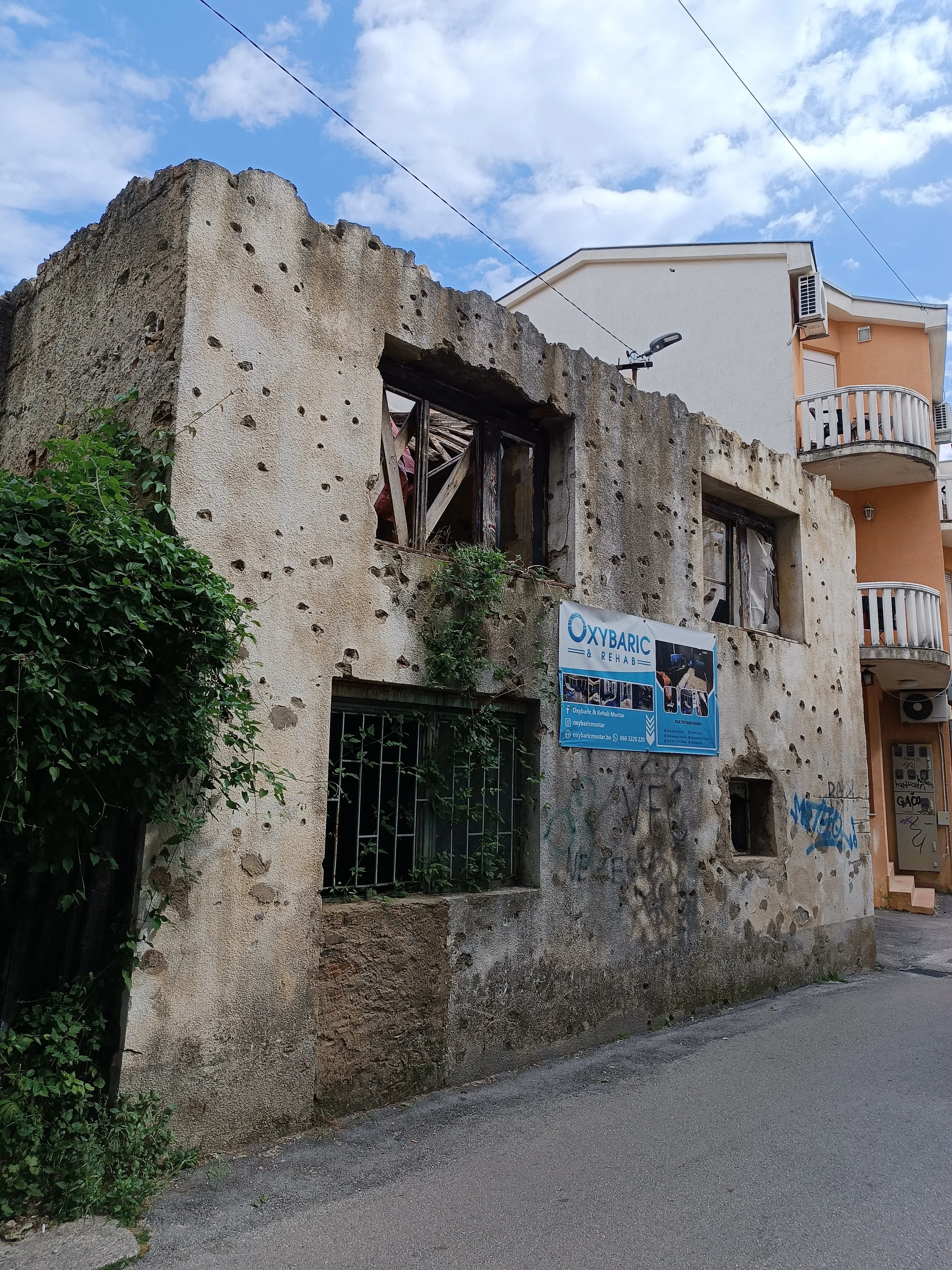 I also visit the famous bridge, take pictures of it, take pictures on it, cross it. Then I frantically flee from the many snapshot lenses, I leave you in peace and seek my own, losing myself in the maze of alleys lined with souvenir shops. Here, bullet casings are sold as pens and key rings, with beautiful craftsmanship in between. I continue walking, a fine network of paths leading me out of the old town and into a residential area. Plate-type buildings, supposedly tristesse. But this prejudice does not work here. The sky is blue and the coating is yellow, and a fabulous mural adorns one of the house walls, oversized, house front size. There is a second one at the back, and many more. Mural world. I stop, turn around, and gaze at these images for a long time. Passers-by cross my path, notice me, follow my gaze upwards, pause, and look at the murals. They look at their city. Nodding, move on. This touches me deeply. How universal it is that we forget to look around in everyday life. Then I continue my way and see a vacant house next door, its unrenovated façade is decorated with bullet holes.